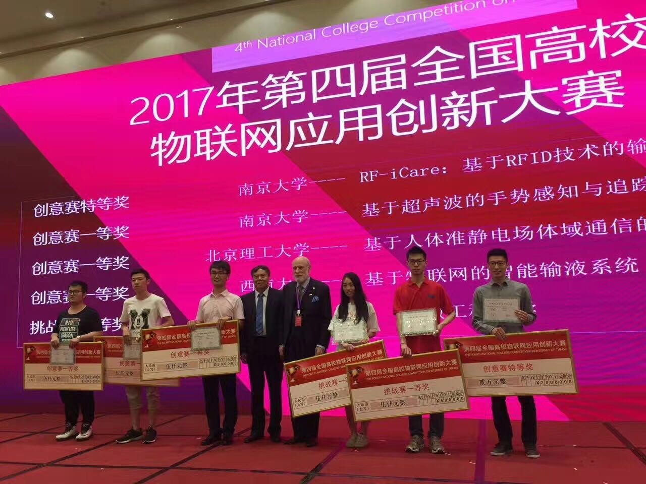 2017年5月12 – 14日,由教育部科技发展中心主办的第四届全国高校物联网应用创新大赛创意赛全国总决赛在东华大学图文信息大楼第一报告厅成功举办。我系分布式计算团队(成员:何兵兵,张柯岩,陆逸嘉;指导教师:谢磊)凭借“RF-iCare:基于RFID技术的输液监测系统”,从全国七大赛区1050只队伍中脱颖而出,获得第1名的优异成绩,夺得创意赛全国特等奖。我系团队(成员:孙珂、凌康;指导教师:戴海鹏)凭借“基于超声波的手势感知与追踪”的项目夺得总决赛第2名和一等奖(其中特等奖一名,一等奖三名,二等奖六名)。谢磊和戴海鹏作为团队指导教师分别获得最佳指导教师奖。在ACM图灵奖五十年中国大会的庆功晚宴暨赛事颁奖典礼上,图灵奖获得者、互联网之父Vinton Cerf和教育部科技发展中心李志民主任参与颁奖典礼,并颁发特等奖和最佳指导老师奖奖牌。出席者还包括图灵奖获得者John Hopcroft,ACM主席Vicki Hanson,ACM Fellow、IEEE Fellow、清华大学软件公司经理刘云浩等。此次总决赛的参赛队伍共有从七大赛区选拔出来的包括伟德国际1946bv、清华大学、武汉大学、哈尔滨工业大学、华中科技大学、西安交通大学等在内的42所高校75支参赛队伍。