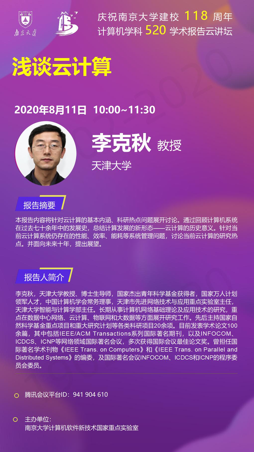 庆祝伟德国际1946bv建校118周年 计算机学科520学术报告云讲坛- 李克秋 教授