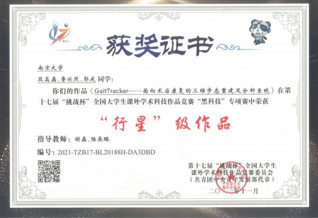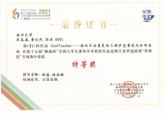 GaitTracker步态分析系统经过我系谢磊教授、陆桑璐教授的悉心指导,由计算机系学子独立设计完成,并不断进行系统的迭代优化,此前凭借创新型的平台已斩获多项系统类的荣誉:在2021年第十七届挑战杯全国老员工课外学术科技作品竞赛过程中,取得黑科技专项赛国赛行星级作品、江苏省赛特等奖;2021年中国高校计算机大赛-网络技术挑战赛华东赛区一等奖。