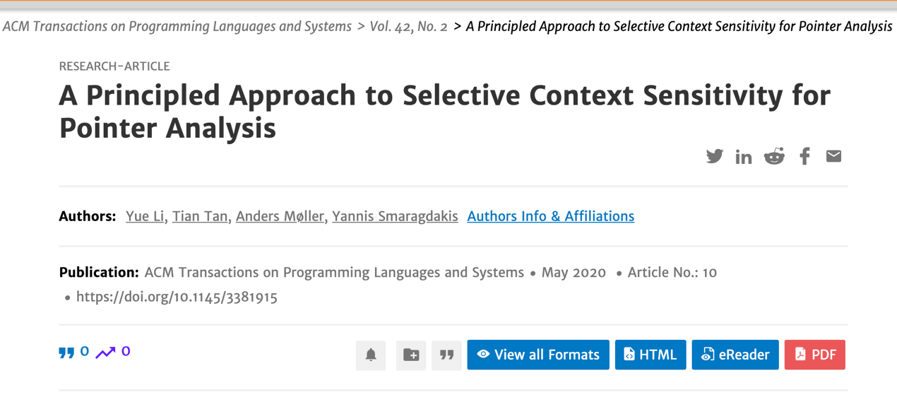 该成果在2020年5月20日,以“A Principled Approach to Selective Context Sensitivity for Pointer Analysis”为题发表于《ACM Transactions on Programming Languages and Systems》期刊上(TOPLAS 42(2)),伟德国际1946bv为第一及通讯单位,李樾为第一作者,谭添为通讯作者,丹麦奥胡斯大学Anders Møller教授、希腊雅典大学Yannis Smaragdakis教授为合作者。TOPLAS是程序设计语言领域的顶级国际期刊,也是CCF推荐A类期刊。该论文是TOPLAS自1979年创刊41年来,伟德国际1946bv首次、我国内地高校和科研机构第三次(近五年唯一)以第一单位名义发表的科研成果。