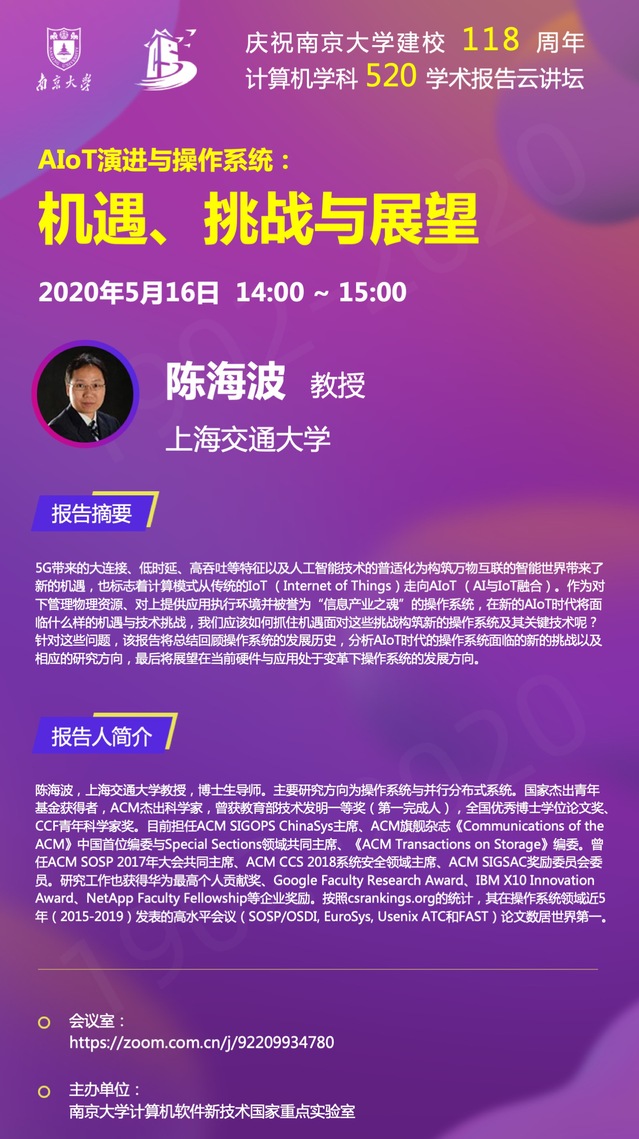 庆祝伟德国际1946bv建校118周年 计算机学科520学术报告云讲坛- 陈海波 教授