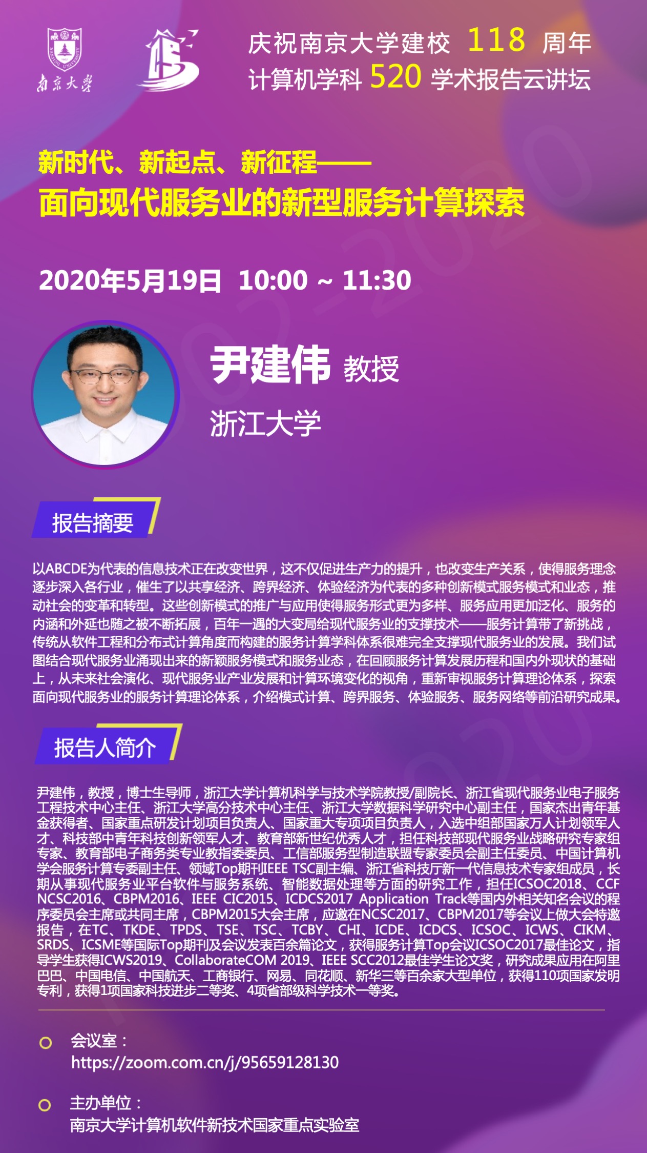 庆祝伟德国际1946bv建校118周年 计算机学科520学术报告云讲坛- 尹建伟 教授
