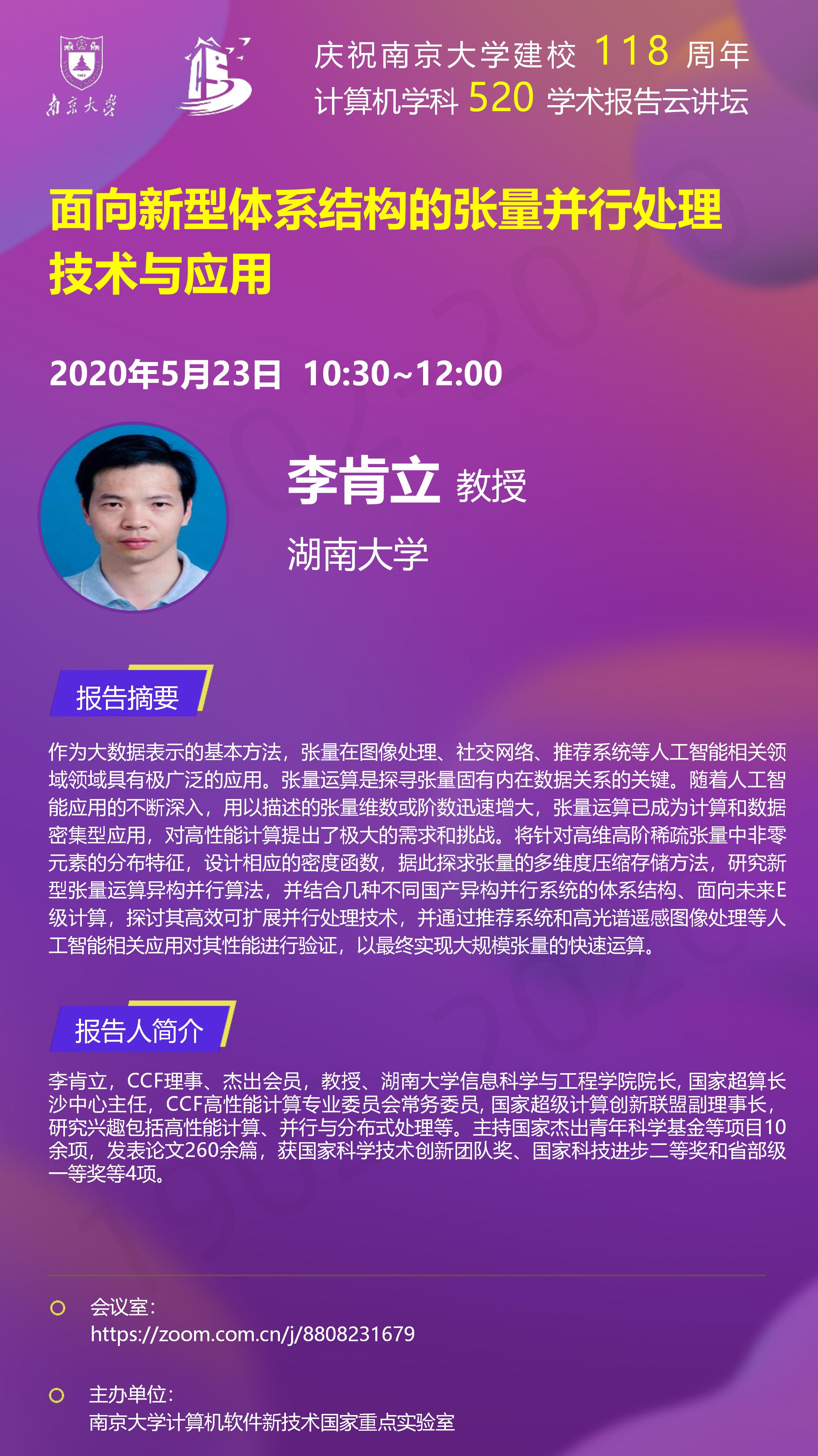 庆祝伟德国际1946bv建校118周年 计算机学科520学术报告云讲坛- 李肯立 教授