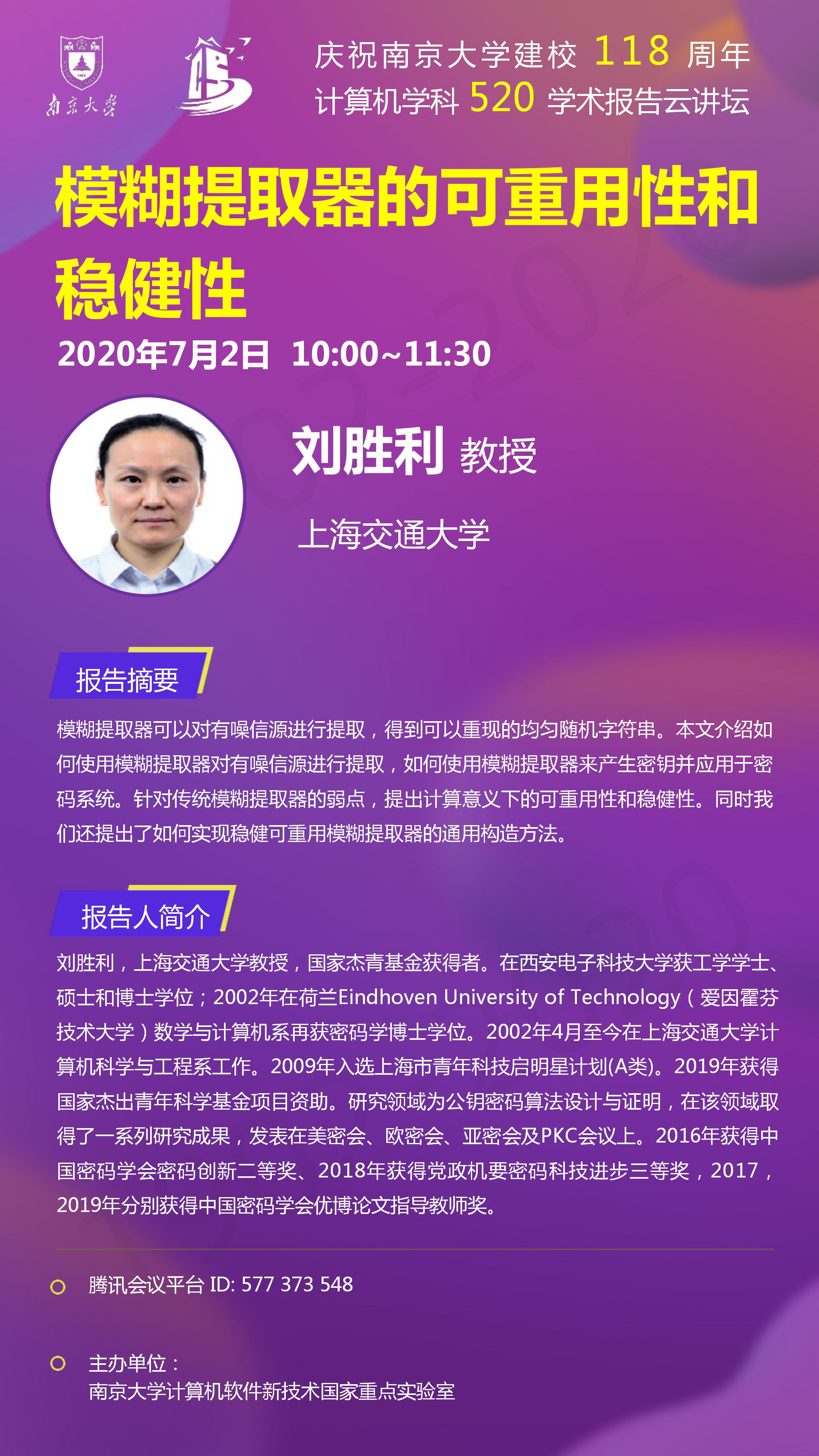 庆祝伟德国际1946bv建校118周年 计算机学科520学术报告云讲坛- 刘胜利 教授