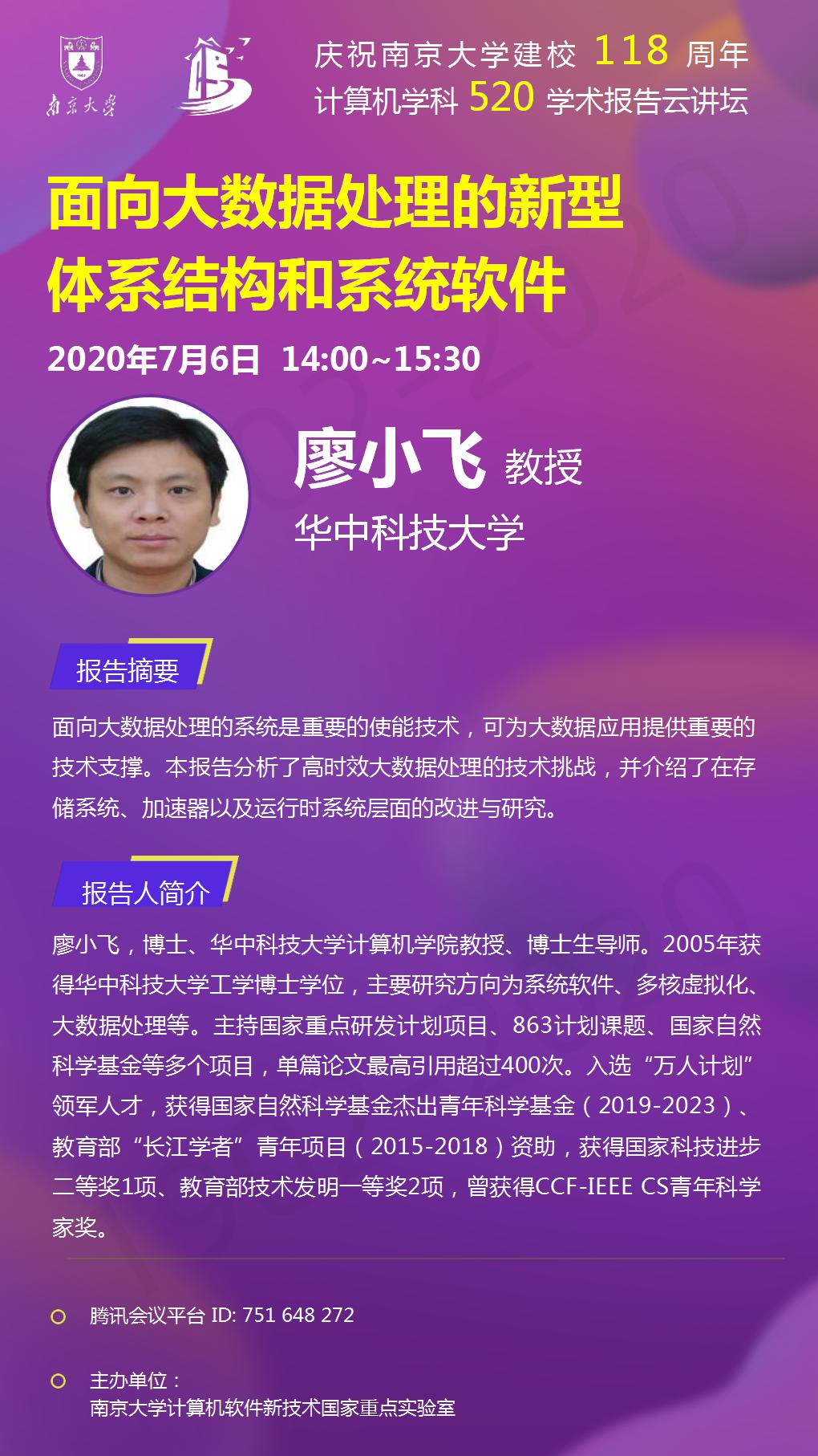 庆祝伟德国际1946bv建校118周年 计算机学科520学术报告云讲坛- 廖小飞 教授