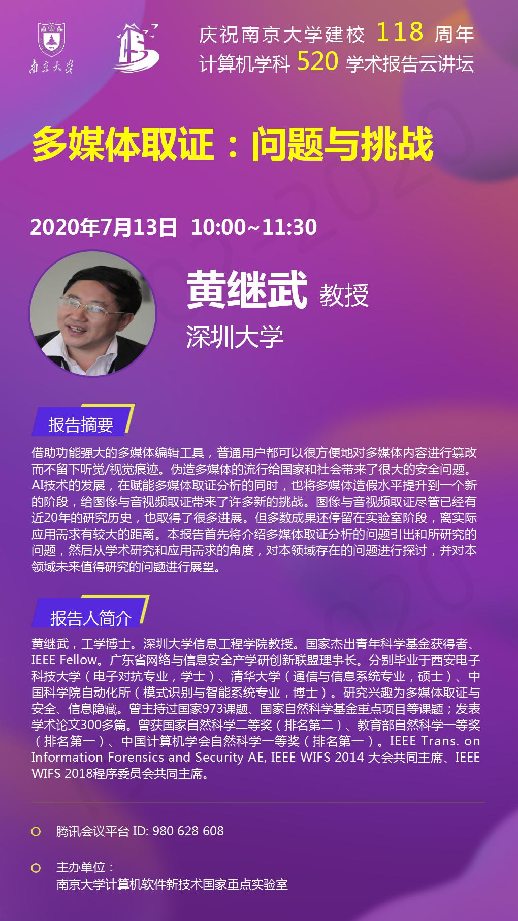 庆祝伟德国际1946bv建校118周年 计算机学科520学术报告云讲坛- 黄继武 教授