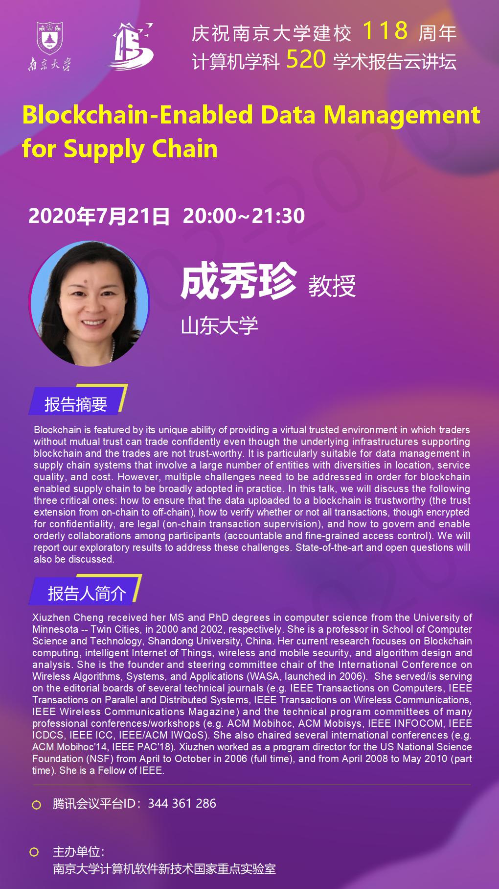 庆祝伟德国际1946bv建校118周年 计算机学科520学术报告云讲坛- 成秀珍 教授