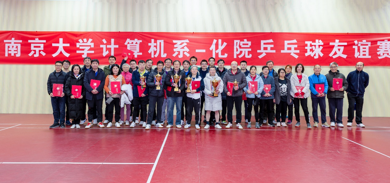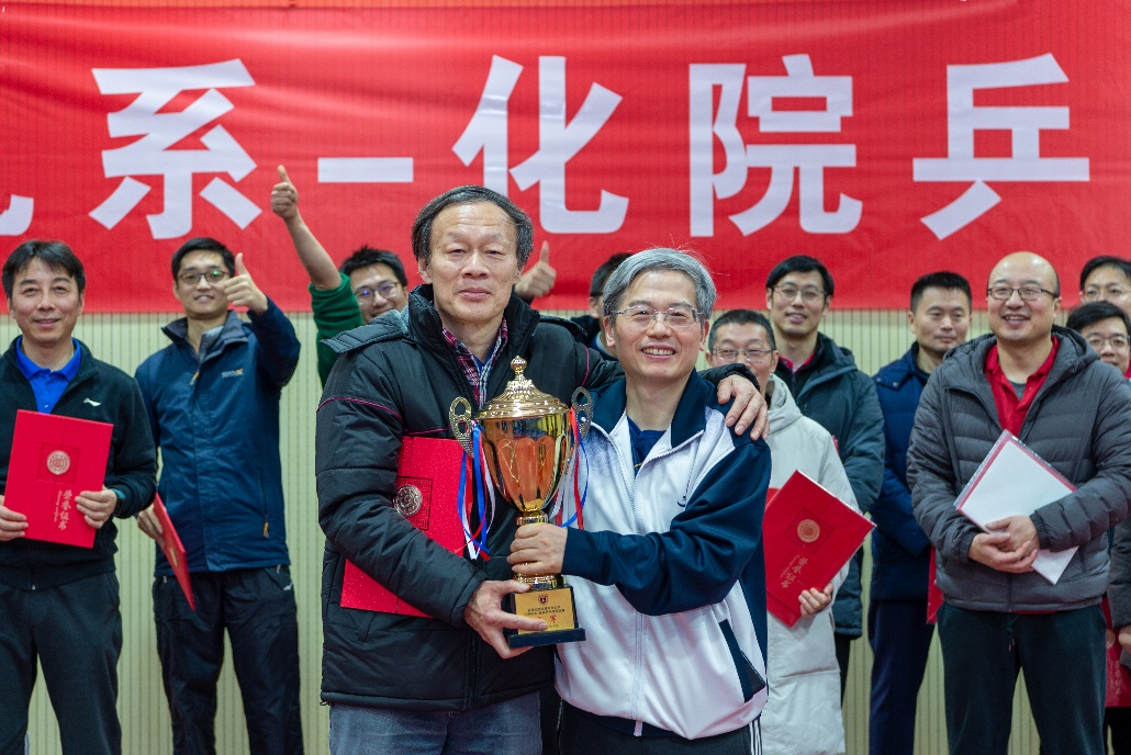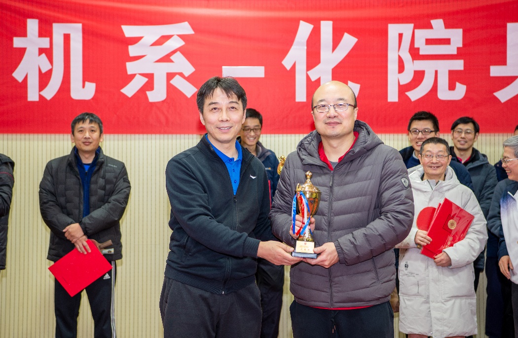 双方运动员在比赛中斗智斗勇、积极拼搏,展现了不断向上、积极进取的精神风貌;和谐的欢声笑语贯穿了比赛全过程,更是体现了双方选手深厚的情谊。充分体现了本次比赛的宗旨:娱乐健身第一,友谊交流第二,比赛胜负第三。计算机系党委书记武港山教授、化院乒乓球领军人胡征教授分别为双方获奖团队、个人进行了颁奖。