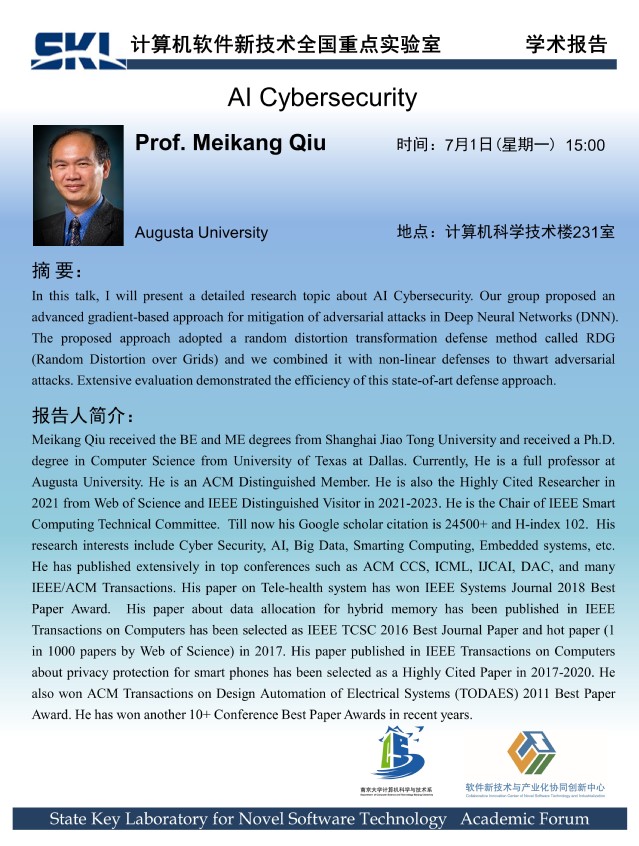 2024年7月1日 “软件新技术讲坛” 学术报告 - Prof. Meikang Qiu