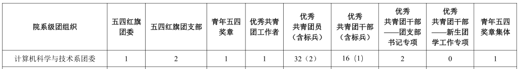 6、优秀共青团干部及标兵(共16个推荐名额,含标兵1个):(1)本科17级、18级、19级各3人,共计9人;(2)研究生(含硕士、博士)共计2人;(3)团委员工会2人【注意:团委员工会产生候选人之后请及时告知候选人所在年级总支以免重复推荐】;(4)研究生会2人【注意:研究生会产生候选人之后请及时告知候选人所在总支、支部以免重复推荐】;(5)系青协1人【注意:系青协产生候选人之后请及时告知候选人所在总支、支部以免重复推荐】。