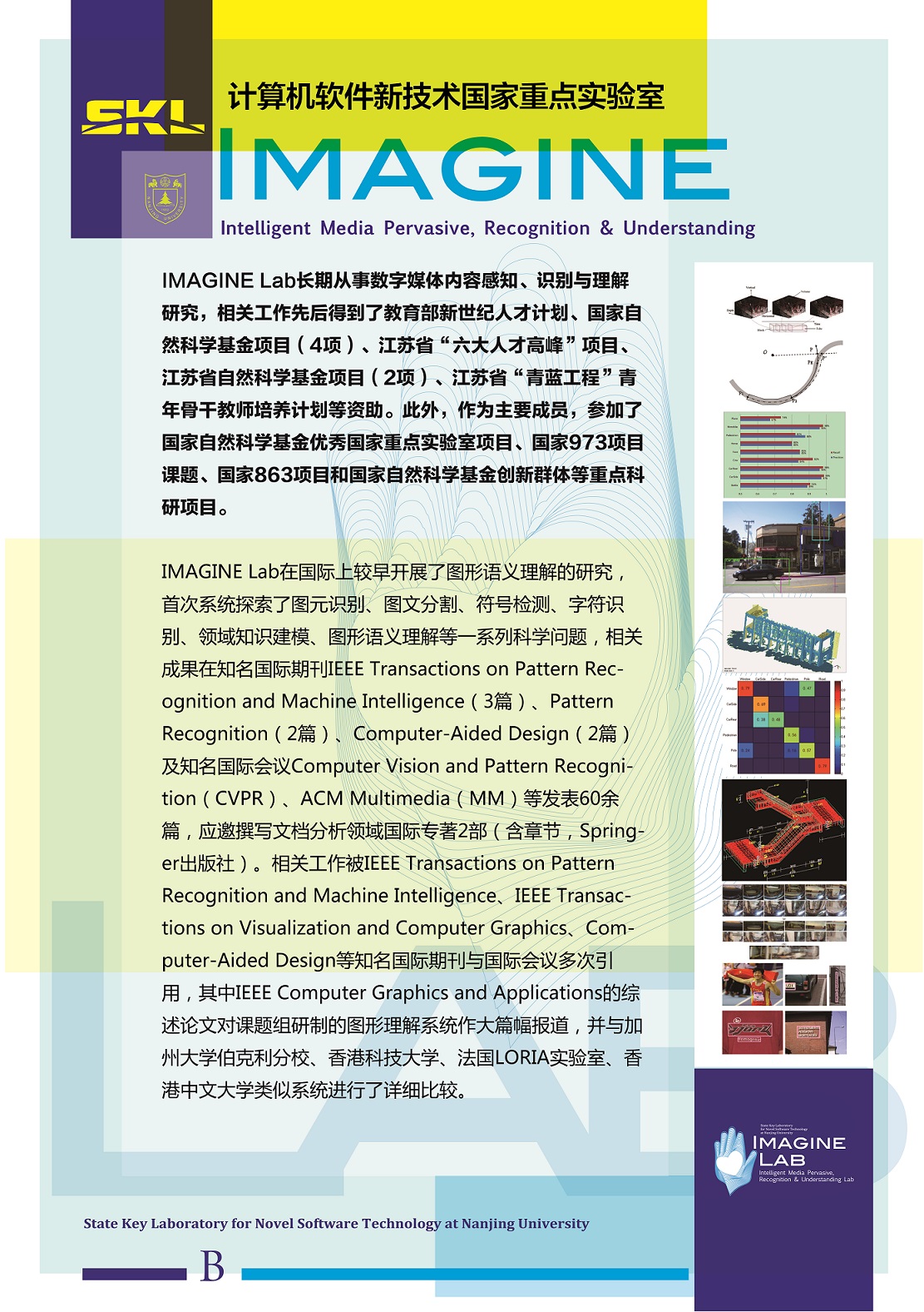 IMAGINE (Intelligent Media pervAsive, recoGnItion & uNdErstanding) is a lab established at National Key Lab for Novel Software and Technology at Nanjing University, China. The targets of IMAGINE lab include both algorithm/theory exploration and real-life systems developing. We believe automatic understanding and visualizing the content of everyday real (big) media data stream is one of the fundamental challenges in computer science, and significant advances will be made over the next few years by combining the state of the art knowledge representations and machine learning or statistical modeling techniques on big multimeida data from Internet.